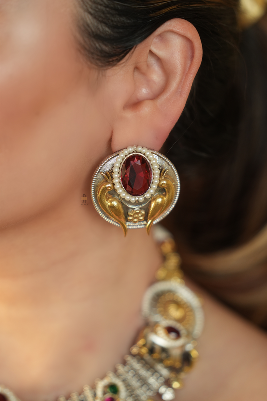 Gold plated kundan moissanite polki jhumka earrings with pearl and kaan ched.