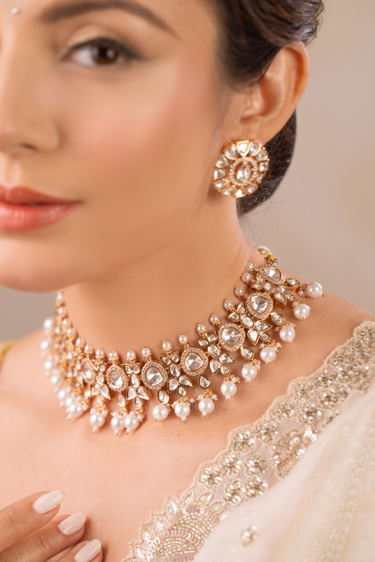Gold plated kundan moissanite polki choker set with pink and white pearls.