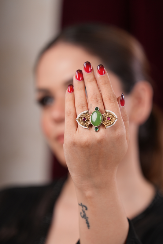 Silver/gold antique finish ring with Ruby/Emerald stone.