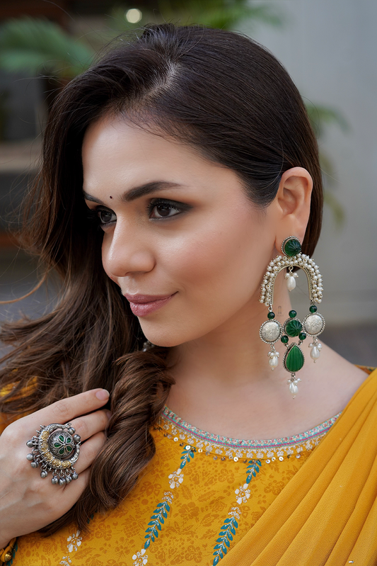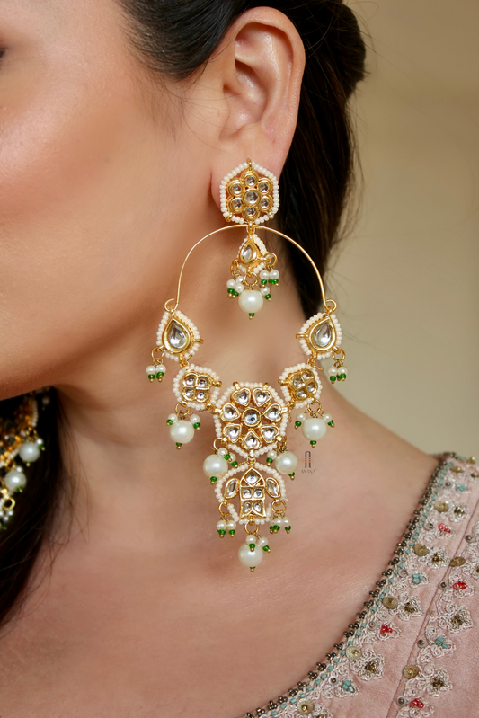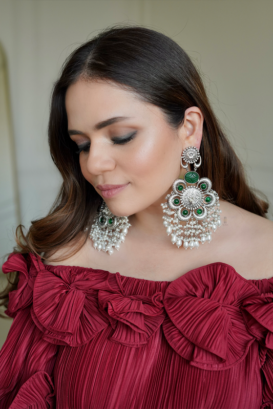 Hand crafted Chand Bali earrings with emerald stoned and white pearls.