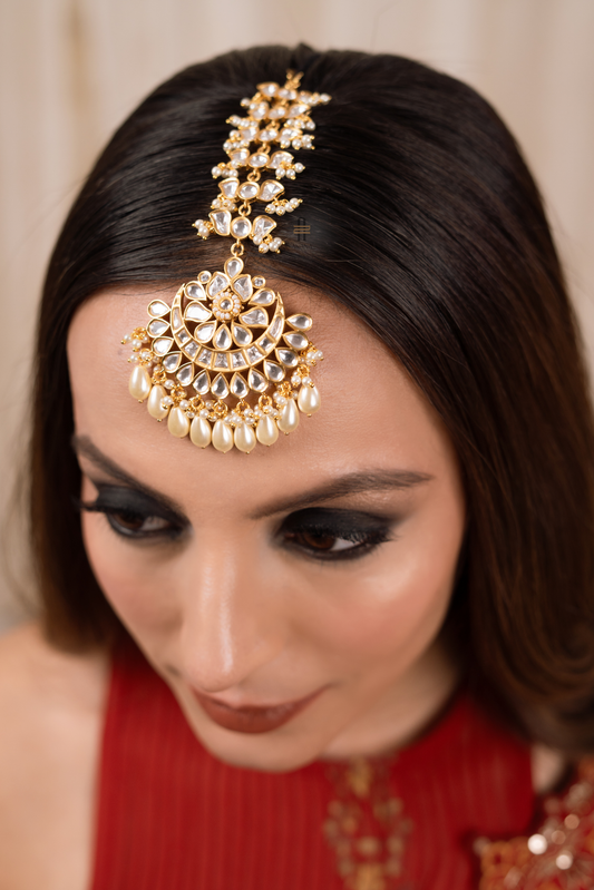Kundan polki maang tikka with white beads.
