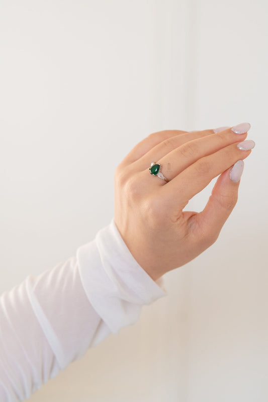 Silver plated hand crafted zircon with emerald stone ring.