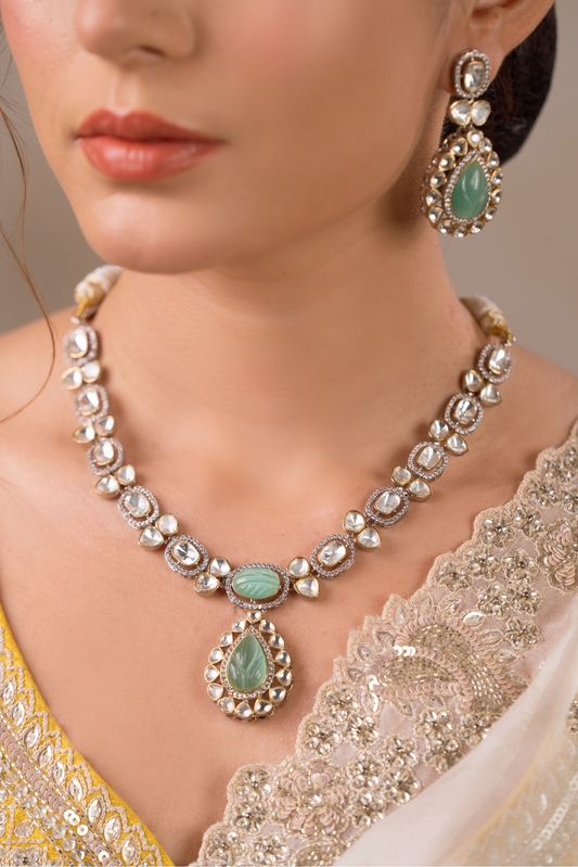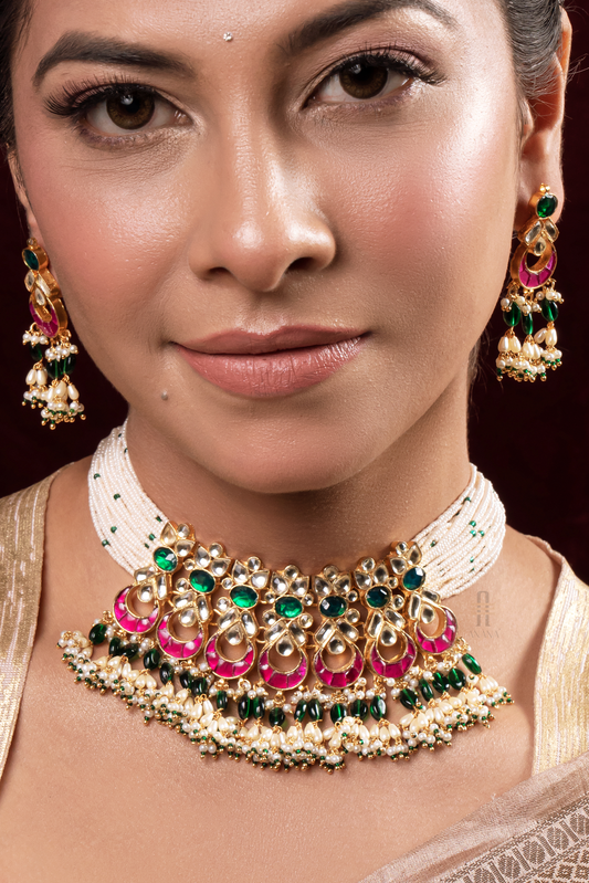 Kundan moissanite polki choker necklace set with green and white pearls.