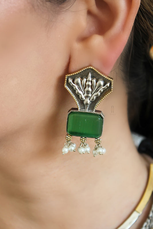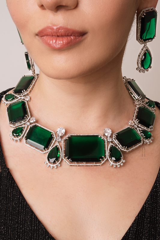 Silver/gold antique finish choker necklace set with rust ruby emerald stones.
