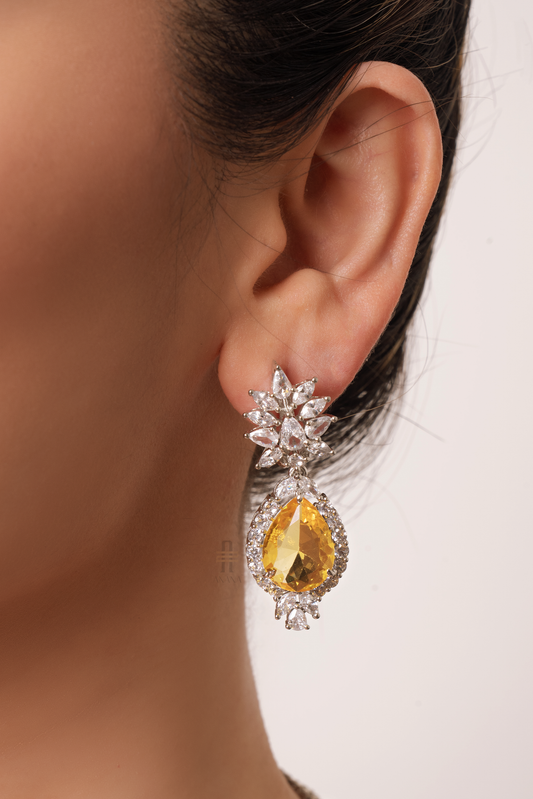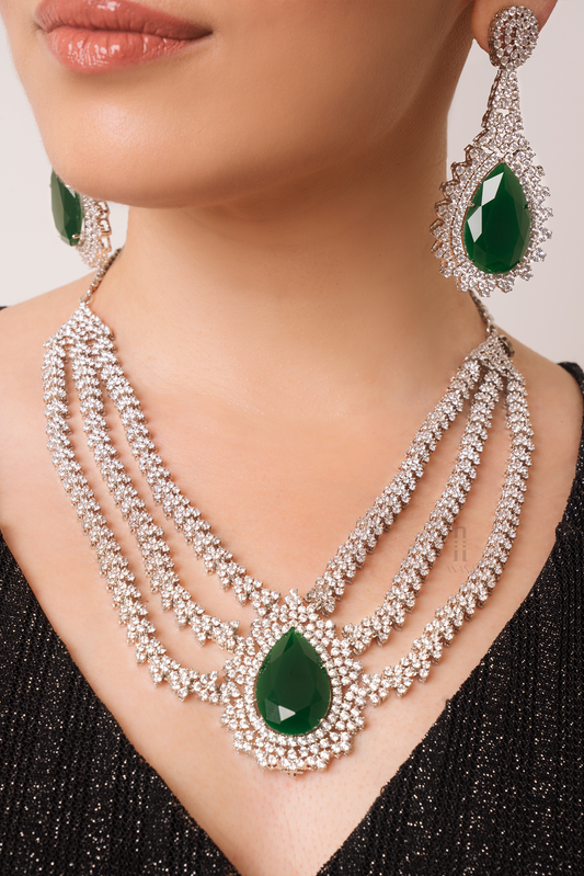 White finish zircon layered pendent necklace set with emerald and yellow stones.