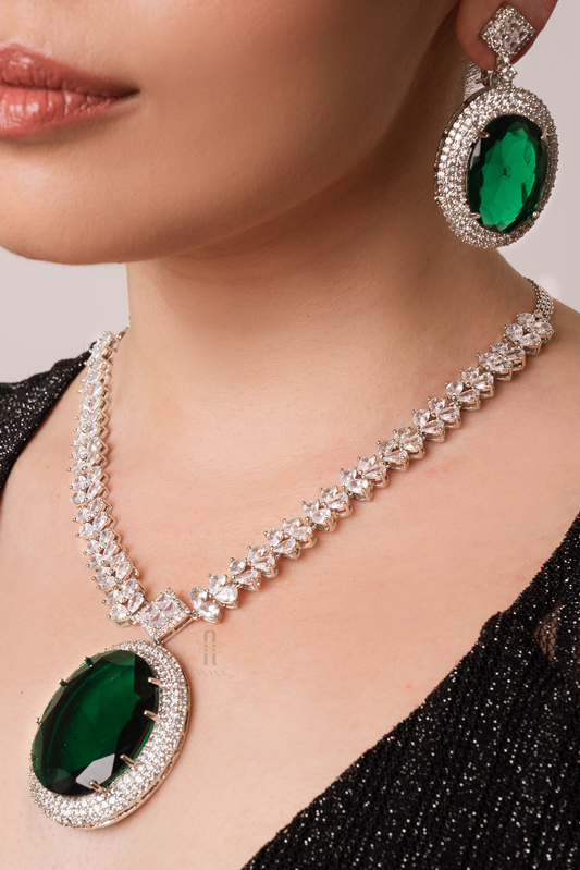White finish zircon pendant necklace set with sapphire and emerald stones.
