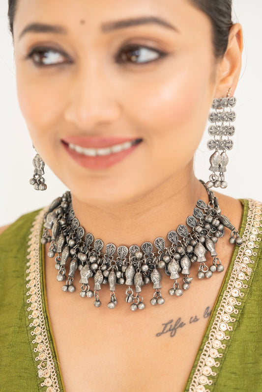 Silver/gold antique finish pendent necklace set with ghungroo.