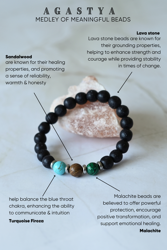 Bracelet with lava, sandalwood, turquoise and malachite beads for men & women.