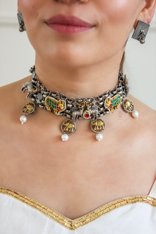 Silver/gold antique finish choker necklace set with white pearl.