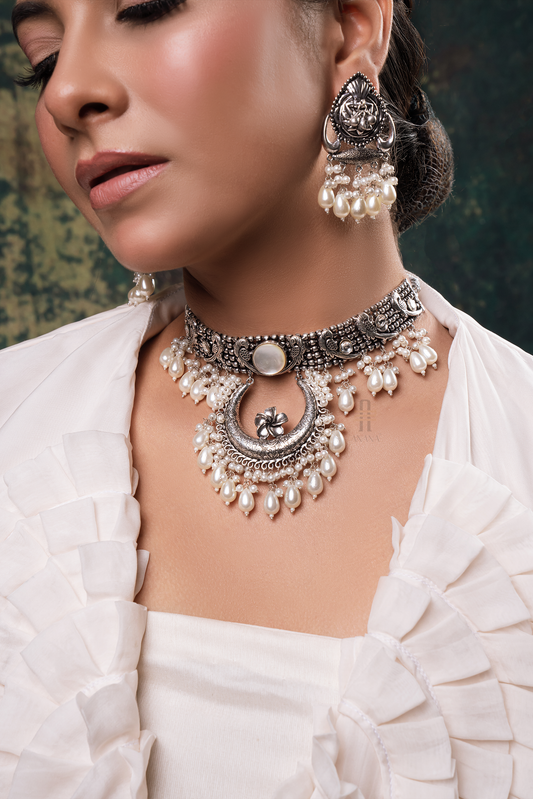 Silver antique finish choker necklace set with white pearl.