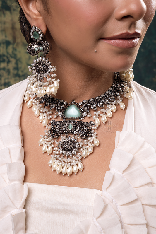 Silver antique finish pendent necklace set with crafted aqua stone and white pearls and ghungroos.